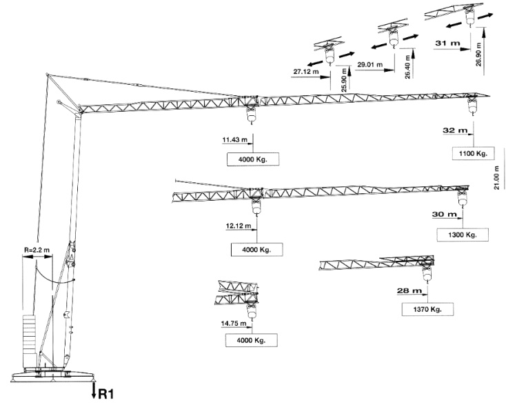 Technické parametry: dosah max. 32 m, rameno lze zkrátit na 30 m, 28 m nebo 14,75 m výška háku při skloněném rameni max. 21 m, výška háku při zdviženém rameni max. 26,9 m nosnost 4000 kg/11,43 m/12,12 m/14,75 m; nosnost na konci ramene 1100 kg/32 m; 1300 kg/30 m; 1370 kg/28 m max. nosnost při zdviženém rameni 1000 kg po celé délce, snadné přepínání mezi jednoduchým nebo dvojitým lanováním napájení 400V; příkon 20 kW; jistič 32 A; kabel 5×10 mm, frekvenční měnič motorů zdvihu a otoče pro plynulou a přesnou manipulaci s břemenem 3 rychlosti pro zdvihání/spouštění břemene, 2 rychlosti pro pojezd kočky, 2 rychlosti otoče tlačítkový ovládací panel, samozatěžování, betonová zátěž – poloměr otáčení 2 m hmotnost ocelové konstrukce jeřábu bez podvozku 10500 kg, celková hmotnost pro přepravu kamionem 32000 kg kompletní jeřáb lze přepravovat na podvalníku (nadměrná přeprava) pozinkovaná konstrukce věže a ramene, konstrukce a bezpečnostní prvky podle norem DIN 15018, DIN 15019, DIN 15020