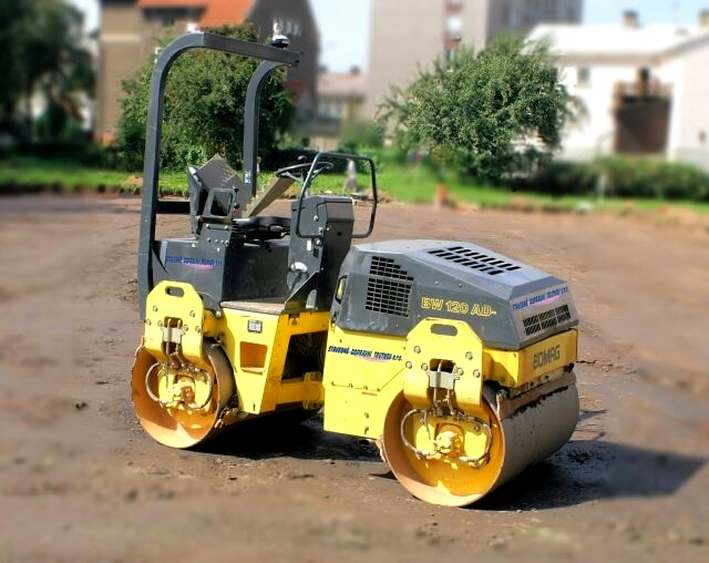 Tandemový vibrační válec s pracovním záběrem 120 cm umožňující hutnění zeminy, štěrků a asfaltů.